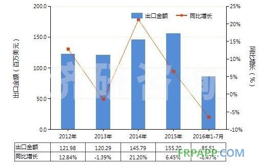圖 2012-2016年7月中國短切玻璃纖維(長度≤50mm)(HS70191100)出口總額及增速統計