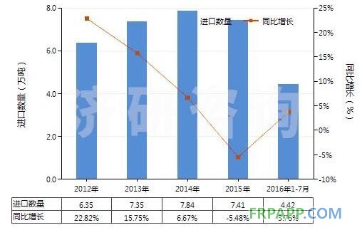 圖 2012-2016年7月中國短切玻璃纖維(長度≤50mm)(HS70191100)進口量及增速統計