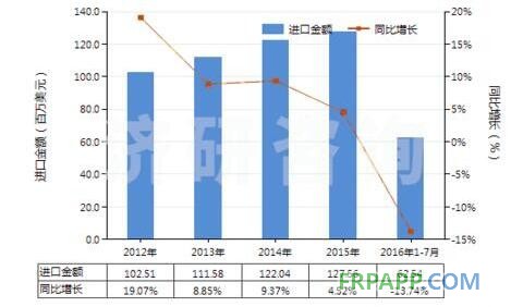 圖 2012-2016年7月中國短切玻璃纖維(長度≤50mm)(HS70191100)進口總額及增速統計