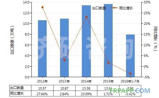 圖 2012-2016年7月中國短切玻璃纖維(長度≤50mm)(HS70191100)出口量及增速統計