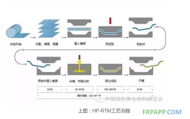 HP-RTM即高壓RTM,是在RTM成型工藝基礎上提高樹脂注射壓力和模壓成型壓力,同時匹配相應的快速固化樹脂,成型過程中揮發成分極少、環境污染少,且生產效率高、自動化適應性強,可大大縮短零件的制造周期,適用于制造大批量高品質的復合材料制品。