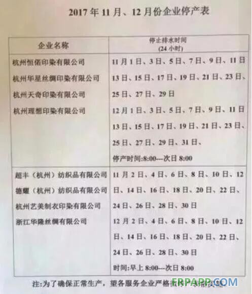 最新消息,余杭8家紡織印染廠(見下圖名單),自11月1日起至12月30日止,分單日(1、3、5、7、9...)和雙日(2、4、6、8、10...)每天輪流停產24小時!每家印染廠共計停產30天和31天!