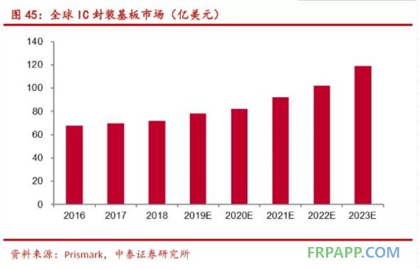 作為半導體材料廠商,封裝基板具備國產替代邏輯。IC封裝基板,又稱IC載板,直接用于搭載芯片,不僅為芯片提供支撐、保護、散熱作用,同時為芯片與PCB母板之間提供電子連接。根據亞化咨詢估算,2018年全球IC封裝材料市場規模達200億美元,其中比重最大的是IC封裝基板,約為73億美元。我們預測,全球IC封裝基板市場穩步增長,2022年將破100億美元。