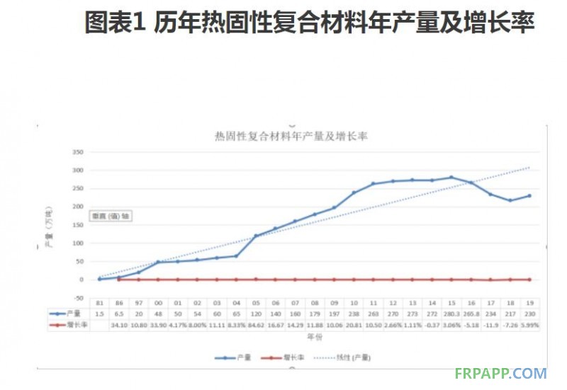 從1981年到2019年可考規模以上企業統計數據(見圖表1)顯示:我國復合材料制品累計產量超過3860.89萬噸(以上數據來源:中國復合材料工業協會)。全國全行業復合材料累計總產量估算超過5000萬噸(本文作者通過樹脂用量測算)。從2016年到2018年,熱固性復合材料產量出現了下降趨勢,分析原因是由于我國環保政策的不斷出臺、環保督察的持續開展,導致大量小微企業及“散亂污”企業受到限產和關停所致。