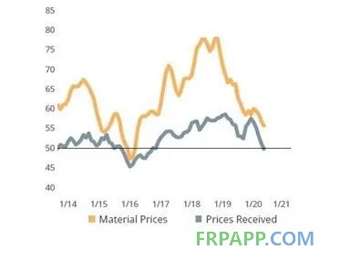 5月份供應商交貨讀數略有下降,這可能預示著前所未有的疫情干擾期的轉折點,這種干擾影響了今年早些時候的上游生產并降低了交貨速度。盡管最近新訂單出現大幅收縮,但上游材料的價格仍在上漲,而5月份復合材料成品價格則有所下降。上一次復合材料成品價格下降的時間是2016年第四季度。供銷價格升降結果的相加意味著復合材料行業利潤率的壓力越來越大。