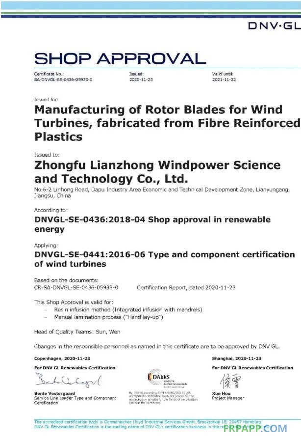 核心提示:近日,中復連眾風電科技有限公司(以下稱風電科技)收到了DNV GL頒發的 SHOP APPROVAL 證書,這標志著風電科技B75風力發電葉片的