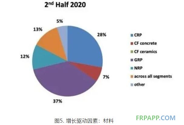 與以往一樣,本次調查顯示,德國、歐洲和亞洲是有望為復合材料行業(yè)提供最重要增長刺激的區(qū)域。對亞洲的預期可能會繼續(xù)上升,而德國和歐洲則有所下降。在材料方面,德國復合材料協(xié)會報告稱,看到了正在進行的模式轉變。在前13次調查中,受訪者始終認為復合材料板塊的主要增長刺激來自碳纖維復合材料CRP,而現(xiàn)在已經是連續(xù)第三次調查中,受訪者提到玻璃纖維復合材料GRP是最重要的材料(見圖5)。
