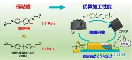 最近,他們首次從成型加工角度設(shè)計(jì)合成了低粘度可降解環(huán)氧單體,通過(guò)真空輔助樹脂傳遞模塑成型工藝(簡(jiǎn)稱“VARTM”),制備出性能優(yōu)異的易回收碳纖維復(fù)合材料。