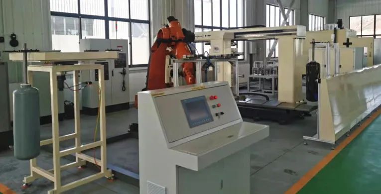 該示范線配置了內(nèi)膽準(zhǔn)備工作站、機(jī)器人上下料及搬運系統(tǒng)、自動樹脂混合和供膠系統(tǒng)、雙驅(qū)纏繞系統(tǒng)、自動貼紗切斷系統(tǒng)、氫氣瓶卸料自動輸送系統(tǒng)、目視檢查和緩沖站、自動固化裝置、待測試氣瓶準(zhǔn)備站等裝置裝備,采用工控機(jī)工作站集中管理各個工位和機(jī)器人,實現(xiàn)了系統(tǒng)的全信息化流程控制。