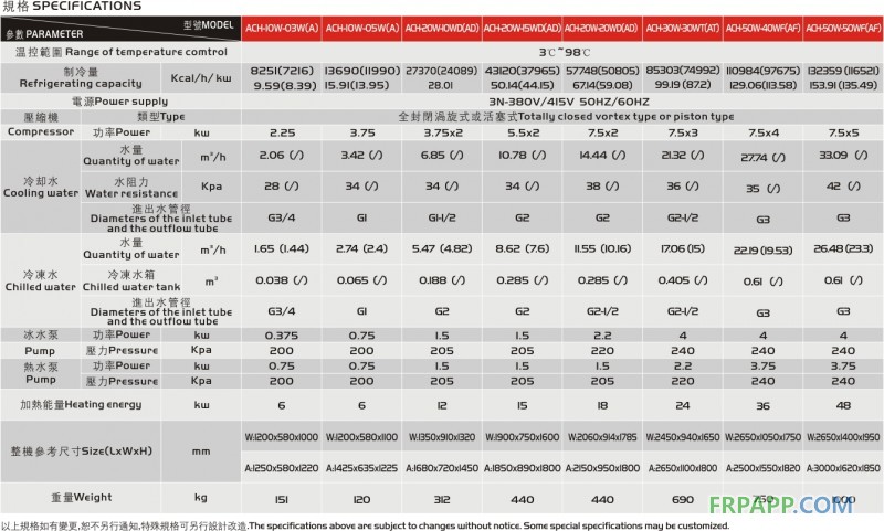 ◆ 電器采用SIEMENS.Weidmuller. LG ◆ 控制方式: 采用進口微電腦或PLC控制(選購) ◆ 安全保護完善,故障顯示, 維修.保養無需專業人員 ◆ 高效率之蒸發器及冷凝器,可節省能源30%以上 ◆ C-20以上采用兩組壓縮機頭.可單獨或共同使用 ◆ 溫度控制范圍: 進水溫+5℃→98℃ |