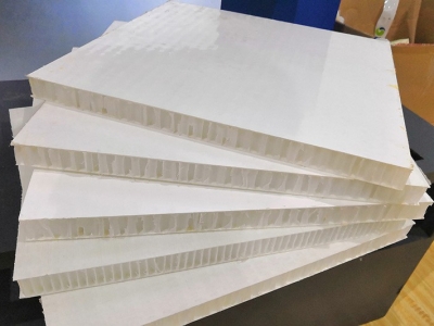 由上下蒙皮和芯材組成的一種夾心三明治結構,上下蒙皮和輕質蜂窩芯為熱塑性材料可以使夾芯板具有輕質高強、可回收的特點。