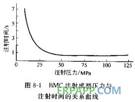 在通常情況下,為了使熱固性塑料適用于注射成型,首先必須提高其流動性。BMC雖然也是屬于熱固性塑料,但由于它有良好的流動性,因此十分適合于注射成型。圖8-1所示用BMC模塑料注射成型125mm * 125mm的儀表盤時所用的注射壓力與注射時間的關(guān)系。從圖中可以清楚地看出,當(dāng)注射壓力升高時,只需要很短的注射時間就可以完成注射充模過程。