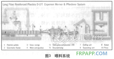 目前市場上主要有3種有影響的工藝,即E—LFRT,D—LFRT和S—LFRT工藝。E—LFRT是同步合成和直接擠出成型或成片;D—LFRT是同步合成和直接擠壓成型;S—LFRT是同步合成和直接注塑成型。這三種主要工藝都要求使用重量式連續喂料,將物料連續精確地喂入擠出機內。LFRT工藝中使用的無論是單螺桿擠出機還是雙螺桿擠出機,都具有獨特的螺桿設計。