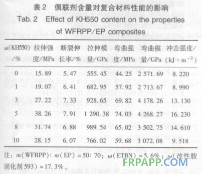 偶聯劑用量以相對于廢玻璃鋼粉質量的百分數計,不同含量的偶聯劑對復合材料性能的影響如表2所示。