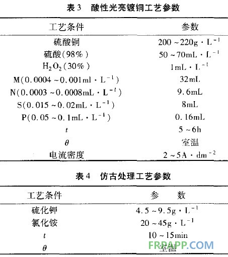 光亮酸性電鍍銅后,進(jìn)行仿古做舊著色。著色后打磨拋光再涂堿式碳酸銅粉末,使工藝品產(chǎn)生青銅器的質(zhì)感。