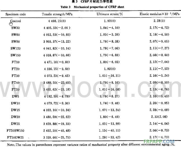 CFRP是一種由增強材料和樹脂基體構成的復合材料,其耐久性除受諸多環境因素的影響外,還取決于材料自身的組成與結構,本次試驗所得的定性結論與文獻等結論相似,但定量結果有一定差別,究其原因是因為CFRP所用的增強材料和樹脂基體的性能及二者的結合方式不同所致。
