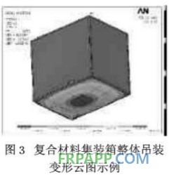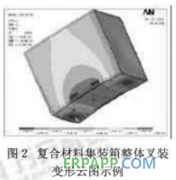 大型結構化通用程序ANSYS中,包括復合材料單元,集裝箱設計所采用的層合板單元,在該程序中也能夠應用,這使得力學分析工作大大簡化,為復合材料集裝箱優化設計工作,提供了較好的設計平臺。圖2為用ANSYS分析得到的復合材料集裝箱整體叉裝變形云圖。圖3為該集裝箱的整體吊裝變形云圖。此外還可以得到其應力云圖,由于篇幅原因,不再列舉。