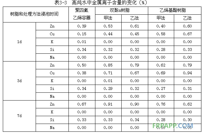 對成型工藝的要求是固化程度高,殘留苯乙烯含量低的玻璃鋼,玻璃鋼必須要后固化后,在使用前必須經過清洗和消毒處理,有時設備表面還須用專門方法進行處理,不同的處理方法效果也是不同的。Hifachi化學公司的試驗結果表明,在玻璃鋼容器存放高純水,水的電導性隨時間而增加,而用乙烯基酯樹脂比雙酚A型聚酯的電導增加要少;用甲法處理的比乙法要好,其指標接近聚四氟乙烯容器里存放的高純水變化指標(見表3-1所示),但在高純水流動的設備里,經24小時流動后,電導就可保持恒定。在細菌檢測中發現,玻璃鋼容器中,隨著浸泡時間增加,細菌含量逐漸減少,其中以乙法處理的乙烯基酯樹脂為最佳(見表3-2)。純水中含金屬離子的測量表明(見表3-3)玻璃鋼容器里基本不含K+、Na+,而Si離子隨時間增加浸泡含量恒定,但Cu、Zn離子隨時間延長而增加,但從何處來尚不明確,而且與樹脂的種類和處理方法無關。
