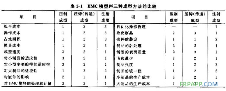 BMC可以用壓制、壓鑄(傳遞)和注射等方式來成型。對于上述成型方法來說,壓制是最古老的方法,也是最簡單的方法。在三種成型方法中,壓制成型所用的設(shè)備、模具的投資最少,但由于成型時(shí)需用人工稱量等加料方式,費(fèi)工費(fèi)時(shí),影響了生產(chǎn)效率。另外,在使用多型腔模具時(shí)也很難將物料均勻地分配到各腔中,因此又會影響到其成型的適應(yīng)性。在實(shí)現(xiàn)一模多腔的成型方面,壓鑄和注射成型是最合適的。壓鑄和注射成型克服了加料困難及加料費(fèi)工費(fèi)時(shí)的問題,生產(chǎn)效率大大提高,勞動成本也下降,并易于實(shí)現(xiàn)生產(chǎn)自動化。在表5-1中,對BMC模塑料的三種成型方法進(jìn)行了比較,表中的“1"是表示最好,"3"是表示最不好。