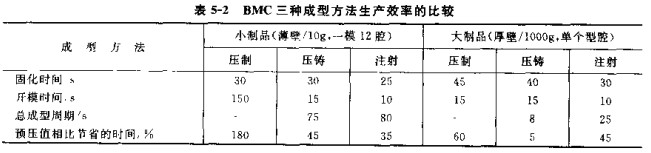 注射成型由于能實(shí)現(xiàn)對物料的自動計(jì)量,因此不但生產(chǎn)成型周期短,而且由于物料要經(jīng)過螺桿機(jī)筒及噴嘴、流道的剪切,摩擦,其整體的溫度不但比較均勻,而且在到達(dá)模腔前就差不多達(dá)到比較接近模具的溫度,物料充入模具以后,很快就能進(jìn)行固化交聯(lián)反應(yīng)。這大大的縮短了所需的固化時(shí)間和成型周期,提高了生產(chǎn)效率。由于具有上述的特點(diǎn),就是注射成型厚壁的制品,其成型周期也會比壓制成型的短。由于在壓制成型時(shí)沒有對物料進(jìn)行強(qiáng)烈擠壓、摩擦和剪切的混合過程,因此,除了經(jīng)過充分預(yù)熱的BMC物料外,模壓的BMC物料主要是靠模具加熱,又由于BMC本身是熱的不良導(dǎo)體,因此升溫時(shí)間長,固化的時(shí)間也長、當(dāng)然生產(chǎn)效率就比較低。在表5-2中對BMC所采用的三種成型方法的生產(chǎn)效率進(jìn)行了比較。