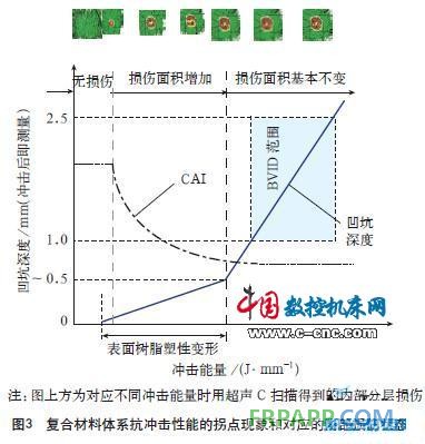 根據上述分析,從進步壓縮設計值的角度考慮,對材料性能的要求是含BVID時具有較高的CAI值。文獻[7]~[9]通過大量的試驗研究發現,含沖擊損傷層壓板的壓縮破壞機理是沖擊損傷四周在加載過程中會出現一特征損傷區,當該區內0°纖維均勻應力達到單向板的壓縮強度時出現破壞,提出可將沖擊損傷區簡化為長軸與損傷寬度相同的橢圓孔,然后采用損傷區纖維斷裂(FD)失效判據來進行估算,該失效判據為:當缺口(或損傷)四周特征長度l0范圍內0°層的均勻軸向應力達到單向板的極限強度時,含損傷層壓板出現破壞。固然該估算方法有一定局限性,但可以說明含BVID層壓板的CAI值與沖擊損傷的面積(或寬度)、復合材料體系的特征尺寸和單向板的壓縮強度有關,因此高損傷容限復合材料體系的研制應從這幾方面著手,特別是盡可能減少BVID時的損傷面積(寬度)。文獻[10]和[11]對沖擊損傷隨沖擊能量增加的擴展規律進行了研究,發現復合材料層壓板的抗沖擊行為呈現有明顯的拐點現象,圖3給出了對應于不同的沖擊能量,作為損傷阻抗標志的凹坑深度和作為損傷容限標志的CAI值的變化規律,同時給出了不同沖擊能量對應的內部損傷狀態。隨沖擊能量的增加其凹坑深度、內部分層損傷狀態和壓縮強度的變化規律是當沖擊能量較小時,沒有凹坑,同時內部沒有損傷;能量增加后可以檢測到凹坑,但深度很淺,目視基本不可見,表明表面樹脂出現了塑性,但內部仍無損傷,同時壓縮強度沒有降低;繼續增加能量,凹坑深度不斷增加(通常仍比較淺),內部開始出現分層損傷,此時壓縮強度開始下降;繼續增加能量,凹坑深度也不斷增加,同時壓縮強度急劇下降;在沖擊能量超過某個值后,凹坑深度(大約為0.5mm)隨能量增加而急劇增加,很快達到了BVID的要求,并可以觀察到沖擊部位表面纖維斷裂,但內部分層損傷面積基本上不再增加,同時其CAI值也基本上不再降低。作者用熱揭層的方法對拐點前后的損傷狀態進行了研究,發現拐點現象的本質是其損傷機理發生了突變,即由單純的基體裂紋和分層到出現沖擊部位表面纖維斷裂,一旦表面纖維開始斷裂,內部的分層區域基本上不再增加,其后續的損傷機理是從表面到內部的纖維斷裂。由于出現拐點時的內部損傷尺寸基本上代表了含BVID試樣可能存在的損傷尺寸,而損傷尺寸決定了CAI值,因此可以通過對影響損傷擴展和控制表面纖維斷裂的因素分析,來確定研制高損傷容限復合材料體系的途徑。控制拐點時損傷尺寸的因素有以下幾點:(1)降低樹脂從分層起始到表面纖維出現斷裂期間的層間分層擴展速率;(2)使拐點盡早出現,即盡早達到纖維的斷裂應變。為此有2種途徑:使沖擊部位的樹脂盡早進進塑性,從而增大局部的纖維應變;采用斷裂應變較低的纖維。