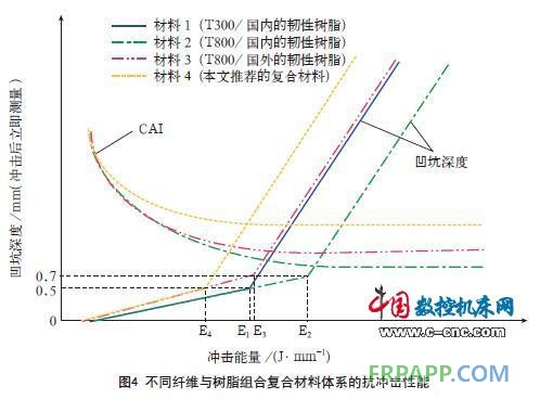 假如研制出具有本文推薦性能指標的碳纖維,可以與目前已有的大多數韌性樹脂進行復合,既可滿足穩定性要求,也有可能較大幅度地進步壓縮設計許用值(如達到5000με),從而實現機翼減重的要求。圖4給出了不同纖維與樹脂組合復合材料體系的抗沖擊性能。