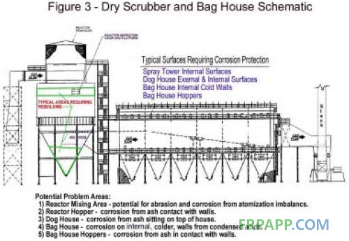 圖3是一個更詳細的典型干法煙氣脫硫/袋式除塵器系統的示意圖。噴霧塔進口受到粉煤灰的較嚴重磨損。由于溫度在300°F(149°C)~375°F(190°C)范圍,腐蝕較輕。當含塵的煙氣和霧化的石灰或石灰石漿液在噴霧塔上部混合,混合流體濺到塔壁使塔壁溫度降到140F(60°C)時,塔壁的腐蝕和磨損問題就非常嚴重。含硫氣體被石灰液滴吸收,干燥的泥漿在干燥/中和過程中仍具有酸性特點。如果這些泥漿噴射并滯留在塔壁和灰斗等,將形成嚴重的腐蝕源。如果漿液中石灰或者石灰石過量,干燥的微粒通常含堿性而不具有腐蝕性。但是,未被吸收的任何可凝結的酸性氣體,尤其是氧化硫氣體,仍然會腐蝕噴霧塔的下游。一般會腐蝕布袋除塵器潔凈氣體側和灰斗內壁。