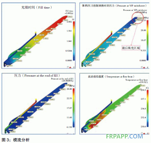 通過合理設(shè)計(jì)注塑工藝參數(shù),可以注塑生產(chǎn)出合格的熱塑性復(fù)合材料葉片產(chǎn)品,每個葉片重量為3780g,公差為±15g,完全達(dá)到葉片設(shè)計(jì)的疲勞斷裂強(qiáng)度要求。