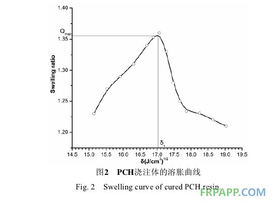 圖 2 顯示了PCH澆注體的溶脹曲線。從圖 2 可見,PCH澆注體在溶脹劑中的最大溶脹比Qmax以及對應的溶脹劑的溶度參數δs=17.04(J/cm3)1/2。根據相似相容原理,δs可以被認為是PCH澆注體的溶度參數值。