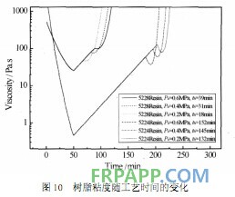 從圖中可以看出兩種樹脂體系的最低粘度差異較大,5228樹脂最低粘度在20Pa s以上,而5224樹脂最低粘度只有0. 5Pa s。圖中粘度曲線的第二個(gè)拐點(diǎn)為加壓時(shí)刻,可以看出雖然兩種樹脂體系平臺(tái)區(qū)粘度不同,得到相同纖維含量的層板,加壓時(shí)刻樹脂粘度基本相同。