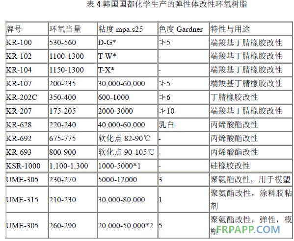 彈性體改性環(huán)氧樹脂目前國內(nèi)尚無商品化生產(chǎn),國外已有系列化產(chǎn)品,主要生產(chǎn)商有日本ACR、東都化成、韓國國都化學(xué)、臺(tái)灣南亞等。以韓國國都化學(xué)產(chǎn)品較具代表性,主要牌號(hào)與性能如表4。