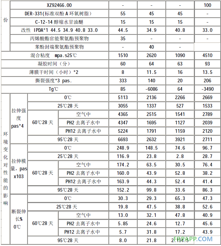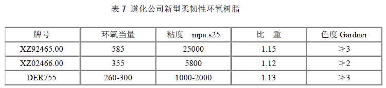 近年,道化公司推出了牌號(hào)為X292465. 00與X202466. 00的兩種新型柔性環(huán)氧樹脂。中,X292465. 00是環(huán)氧端基的脂肪族二醇結(jié)構(gòu)的柔性鏈環(huán)氧樹脂;X202466. 00是芳香族環(huán)氧封端的脂肪族二醇結(jié)構(gòu)的環(huán)氧樹脂以及與脂肪族縮水甘油醚活性稀釋劑、芳香族環(huán)氧樹脂的復(fù)配物。此外,還有一種新型柔性環(huán)氧樹脂牌號(hào)為DER755,結(jié)構(gòu)為環(huán)氧氯丙烷、雙酚A、聚丙二的反應(yīng)產(chǎn)物。主要物性指標(biāo)如表7。