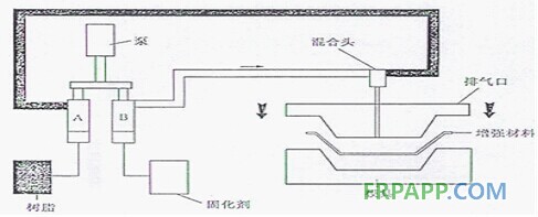 將兩種或兩種以上的組分在混合區(qū)低壓(0.5MPa)混合后,即在低壓(0.5-1.5MPa)下注射到閉模中反應(yīng)成型,此即為工藝過(guò)程。若組分一為多元醇,一為異氰酸酯,則反應(yīng)生成聚氨酯 。為增加強(qiáng)度,可直接在一種組分內(nèi)行加入磨碎玻纖原絲和(或)填料。亦可采用長(zhǎng)纖維(如連續(xù)纖維氈、織物、復(fù)合氈、短切原絲等的預(yù)成型物等)增強(qiáng),在注射前將長(zhǎng)纖維增強(qiáng)材料預(yù)先置模具內(nèi)。用此法可得到高力學(xué)性能的制品。