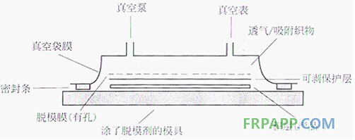 此法是手糊法與噴射法的延伸。將手糊或噴射好的積層在樹(shù)脂的A階段與模具在一 起,在積層上覆以橡膠袋,周邊密封,在后用真空泵抽真空,使積層受到不大于1個(gè)氣壓的壓力,而被壓實(shí)、固化、成型。