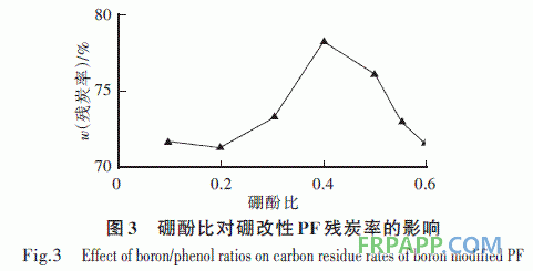 在其他條件保持不變的前提下(如醛酚比為1.8等),硼酚比對(duì)硼改性PF 殘?zhí)柯实挠绊懭鐖D3 所示。由圖3可知:硼改性PF的殘?zhí)柯孰S硼酚比增加呈先降后升再降態(tài)勢(shì),并且在硼酚比為0.40時(shí)相對(duì)最大。