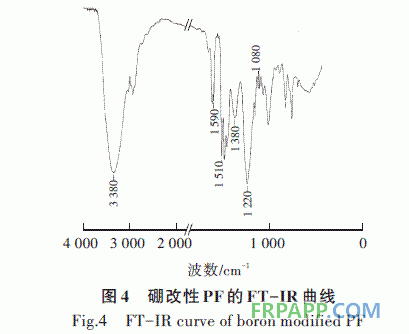圖4為硼改性PF的FT-IR曲線[如n(苯酚)∶n(甲醛)∶n(硼酸)=1∶1.7∶0.3等]。由圖4可知:1 380 cm-1處是B—O的伸縮振動(dòng)特征吸收峰,1 590、1 510 cm-1處是苯環(huán)骨架的伸縮振動(dòng)特征吸收峰,1 220 cm-1處是酚羥基中Ph—O的特征吸收峰;1 080 cm-1處是醚鍵的對(duì)稱伸縮振動(dòng)特征吸收峰,3 380 cm-1處是羥基的強(qiáng)而寬特征吸收峰。上述這些特征吸收峰的出現(xiàn),證明了硼元素已引入PF 的分子鏈中,即硼改性PF的預(yù)期結(jié)構(gòu)被成功合成[3-4]。