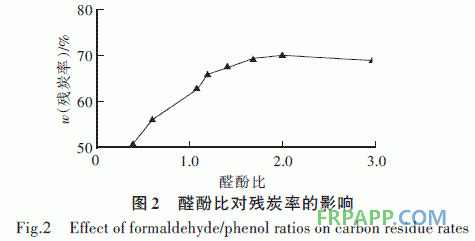 理論上醛酚比=n(甲醛)/n(苯酚)=n(F)/n(P)=1.5時(shí),合成的硼改性PF 具有相對(duì)最完整的結(jié)構(gòu),固化后該樹脂的交聯(lián)密度相對(duì)最大,并且其殘?zhí)柯氏鄬?duì)最高;然而,實(shí)際使用過程中,其殘?zhí)柯实睦碚撝岛蛯?shí)測(cè)值有偏差。因此,本研究在其他條件保持不變的前提下[如硼酚比=n(硼酸)/n(苯酚)=0.3等],考察了醛酚比對(duì)硼改性PF殘?zhí)柯实挠绊懀Y(jié)果如圖2所示。