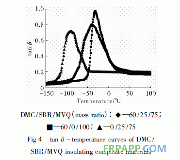由圖3 可以看出,在相同溫度下,質量比為60 /25 /75 的DMC /SBR/MVQ 絕緣復合材料的儲能模量( E’) 最高,質量比為60 /0 /100 材料的E’次之,質量比為0 /25 /75 材料的E’最低。其原因可以解釋為E’是材料剛性的表征,DMC 的剛性比橡膠的大( 不論是玻璃態還是高彈態) ,因此含DMC 的絕緣復合材料的E’始終高于同溫度下不含DMC 的材料。另外,由于MVQ 比SBR 柔軟,所以質量比為60 /25 /75 的DMC /SBR/MVQ 材料的E’高于質量比為60 /0 /100 材料的E’。此外,DMC 中玻璃纖維均勻分散在SBR/MVQ 的并用膠中,起到骨架作用,而DMC 中少量的不飽和聚酯能夠與SBR/MVQ 并用膠交聯,形成大量交聯點,由此可知DMC 的加入能夠限制SBR/MVQ 并用膠分子鏈段的運動,使材料的E’增大。