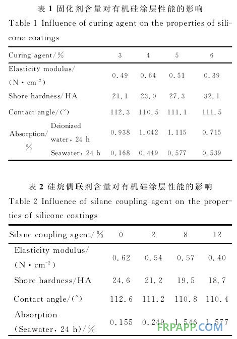 涂層的邵氏硬度與涂料的固化程度有直接的關(guān)系,交聯(lián)固化程度越高邵氏硬度越高。由表1可知,固化劑用量增加,涂層的邵氏硬度也增加。原因在于固化劑含量增加,固化反應(yīng)的交聯(lián)點(diǎn)增加,交聯(lián)結(jié)構(gòu)中柔性硅鏈的長(zhǎng)度相應(yīng)減小,涂層的硬度和剛性增大。而硅烷偶聯(lián)劑的增加則導(dǎo)致邵氏硬度的降低(表2),原因是硅烷偶聯(lián)劑的增加對(duì)硅橡膠起著類(lèi)似物理增塑的效果,使得硅橡膠大分子相互距離增大[11],降低了硬度。