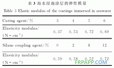 兩種環(huán)境結(jié)合起來(lái)可得,在固化劑添加量為3%時(shí),涂料的彈性模量較小。硅烷偶聯(lián)劑添加量在8%以下的涂層對(duì)海水浸泡和空氣靜置處理不敏感;硅烷偶聯(lián)劑添加12%的涂層,海水浸泡后的試樣有較高的彈性模量,空氣靜置則彈性模量較低。考慮到船舶服役的環(huán)境,以及彈性模量對(duì)涂料防污性能的影響,硅烷偶聯(lián)劑添加小于8%比較合適。Robert等人[14]的研究表明,有機(jī)硅彈性體涂料彈性模量低,附著生物傾向于剝離方式脫落,并且這種剝離脫落方式所需要的能量較小。所以固化劑添加少的彈性模量小,會(huì)有較好的防污能力。