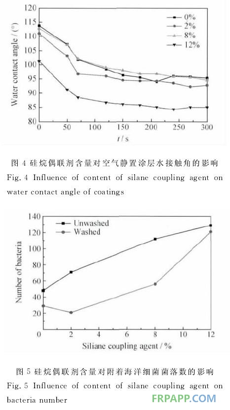 (3)過(guò)高的固化劑添加量會(huì)導(dǎo)致硅氧鏈的交聯(lián)程度增加,網(wǎng)狀結(jié)構(gòu)變密,增加涂層的硬度,不利于涂層的防污性能;過(guò)高的硅烷偶聯(lián)劑添加量會(huì)導(dǎo)致涂層表面的親水基團(tuán)增多,水接觸角降低,海洋細(xì)菌附著增加。