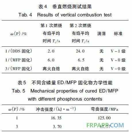 樹脂垂直燃燒測試結果及不同ED/MFP 固化物力學性能見表4 和表5。
