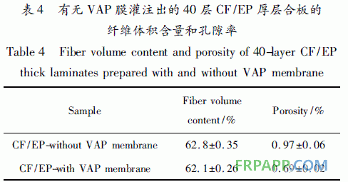 VARTM 工藝在成型復(fù)合材料時雖然具有低成本的優(yōu)勢,但也存在質(zhì)量穩(wěn)定性差( 如孔隙和干斑等缺陷不容易控制) 、纖維含量和材料厚度尺寸不均勻等問題,尤其是在成型大型CFRP 風(fēng)電葉片主梁這樣的厚制件時,這些問題變得更為突出。解決這些問題的一個關(guān)鍵因素是在成型過程中將材料體系中的氣體有效排出,并保證樹脂能夠在增強材料中較為穩(wěn)定的流動。采用VAP 單向透氣膜輔助CFRP復(fù)合材料的VARTM 成型是解決方案之一。表4 是未采用VAP 單向透氣膜和采用VAP 單向透氣膜灌注出的40 層CF /EP 復(fù)合材料層合板的纖維體積含量和孔隙率。