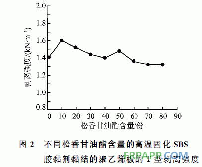 拉伸剪切強度測試是按照標準GB/T 7124—2008規定的方法進行,試驗時采用深圳瑞格爾儀器有限公司的RG-3000A型微機控制電子萬能試驗機對已固化連接好的聚乙烯板材試樣進行拉伸剪切強度測試,拉伸速度為100mm/min。根據相關文獻報導,SBS膠黏劑黏結聚乙烯板材時,剪切強度一般為0.5~0.7 MPa。當我們在SBS膠黏劑中加入DCP交聯劑后成為高溫固化SBS膠黏劑,黏結聚乙烯板材時,剪切強度達到1.6MPa以上。這是因為DCP交聯了SBS中的雙鍵,使其形成了空間網狀結構,剪切強度也隨之增高。圖1示出了不同松香甘油酯含量的高溫固化SBS膠黏劑黏結聚乙烯板的剪切強度。從圖中可以看出,隨著松香甘油酯含量的增加,黏結的聚乙烯板的剪切強度增加,可達2.0MPa以上,但當松香甘油酯含量超過40份,膠黏劑的剪切強度不再增加,最后趨于恒定。我們分析這是因為松香甘油酯是高軟化點的增黏樹脂,增加松香甘油酯含量可以增強膠黏劑的剪切強度;并且在加熱固化階段,部分松香甘油酯還會與SBS發生交聯,從而進一步提高膠黏劑的強度;但是恒定的固化溫度和時間下發生的化學交聯程度是一定的,因而再進一步增加松香甘油酯含量也不能提高膠黏劑的剪切強度了。此外,由于剪切強度測試是在膠黏劑固化后放置2天才進行的,這段時間使SBS膠黏劑中苯乙烯嵌段獲得了類似橡膠類彈性體的“回彈”,逐漸地回到原來的物理交聯點位置,使剪切強度獲得可靠的平行測試結果。