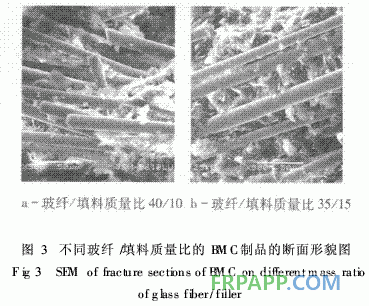 圖3是用掃描電鏡觀察到的BMC制品的斷面形貌圖。由圖可知,玻纖/填料質量比為40/10的制品,纖維與樹脂分離嚴重,有樹脂堆積,纖維含量集中,當玻纖不能達到理想分散時,在材料內部易產生缺乏玻纖的區域,成為應力集中點,使得BMC的力學性能降低。而玻纖/填料質量比為35/15的BMC制品中纖維分布均勻,含量高,與樹脂粘接良好,制品缺陷少,力學性能和電性能都很理想。