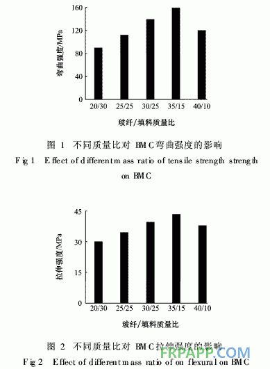 玻璃纖維是BMC的增強體,它的含量對在BMC制品的力學性能有決定性的影響。玻纖/填料質量比小,玻纖含量少而填料的含量卻高,填料的增強效果比玻纖差,但玻纖不能達到理想分散時,在材料內部易產生缺乏玻纖的區域,成為應力集中點,使得BMC的力學性能降低;當玻纖填料質量比較大時,玻纖容易貫穿整個材料,就可以克服上述缺陷。圖1、2是纖維/填料質量比對制品彎曲強度和拉伸強度的影響。