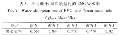吸水率是反映材料性能的一個重要指標。通過吸水率可以得出環氧BMC板材內部的密實程度,氣孔的多少,以此來判定板材的性能[15]。通過測試不同玻纖/填料質量比的BMC制品的吸水率,可以得出耐水性好,缺陷少的最佳配方。