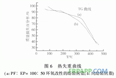 圖6是PF∶EP=100∶50改性的酚醛樹脂和純酚醛樹脂 的熱失重曲線,由圖可看出,除了當溫度低于125℃以前由于 失水造成的熱損失a>b外,真正由于溫度升高使有機物分解 而造成的熱失重始終是環氧改性過的酚醛樹脂要小于純的酚 醛樹脂,即是說改性過后酚醛樹脂的耐熱性能有所提高。如 在300℃時,該溫度是一般的耐高溫聚合物的使用溫度,從圖 中可看出,曲線(a)的質量殘留率為85%左右,而(b)純的酚醛 樹脂在該溫度下的質量殘留率已減少至77%左右。