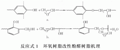 環(huán)氧改性酚醛樹脂,是由酚醛樹脂和雙酚A型環(huán)氧樹脂混合物制成的復合材料,兼具兩種樹脂的優(yōu)點,改善各自的缺點,從而達到改性目的。這種改性是通過酚醛樹脂中的羥甲基與環(huán)氧樹脂中的羥基及環(huán)氧基進行化學反應(反應式1a), 以及酚醛樹脂中的酚羥基與環(huán)氧樹脂中的環(huán)氧基進行化學反 應(式1.b),反應結(jié)果將使高分子網(wǎng)絡交聯(lián)形成更為復雜的體型結(jié)構(gòu),而使材料的內(nèi)部聯(lián)結(jié)更加緊密,耐腐蝕性能有所提高。