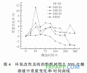 圖4是環(huán)氧改性及純的酚醛樹脂在50%鹽酸溶液中重量 變化率-時間曲線。從圖可看出,除了PF∶EP=100∶10這一 配方△%約為10%左右,PF∶EP=100∶30及PF∶EP=100 ∶50這兩個配方的改性酚醛樹脂△%均小于5%,與濃度同 為50%的硫酸溶液相比(圖2),環(huán)氧改性酚醛樹脂在鹽酸中 的質(zhì)量損失小于硫酸中的質(zhì)量損失,說明試樣在非氧化性酸 中的耐腐蝕性能優(yōu)于氧化性酸中的耐腐蝕性能。而純酚醛樹 脂的失重曲線腐蝕初期變化較平穩(wěn),原因在于在這種環(huán)境下, 純酚醛樹脂腐蝕速率和吸水速率大致相當,使得由于受腐蝕 減少的質(zhì)量和吸水增加的質(zhì)量相抵消,體現(xiàn)在失重曲線上就 表現(xiàn)為一段很平滑的區(qū)域。等到117h時,吸水達到平衡,此 時由于腐蝕程度的增加,吸水已經(jīng)無法彌補減少的質(zhì)量,失重 曲線開始緩慢下降。在這種腐蝕環(huán)境下,環(huán)氧改性酚醛樹脂 與純酚醛樹脂的耐腐蝕性能差別不大。
